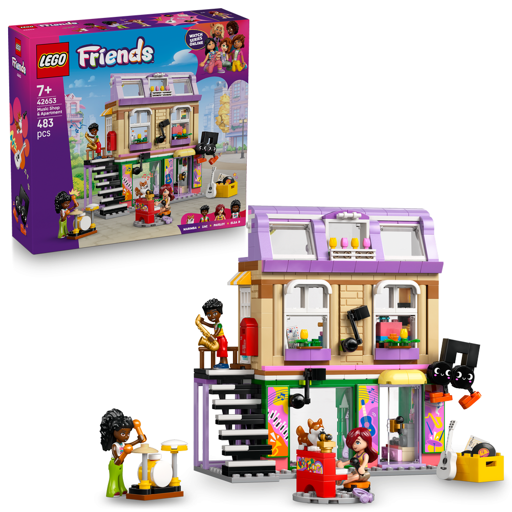 - A building set gift for music-lovers – This LEGO® Friends Music Store & Apartment set includes lots of music-inspired accessories, including a toy drum kit, piano, guitar, saxophone and more