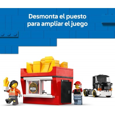 El colorido camión de comida cuenta con un puesto desmontable en forma de petaca gigante de patatas fritas. Los niños pueden quitar el techo para acceder a una detallada área de preparación de alimentos con freidora, salsas y una ventanilla corredera de servicio. Este modelo de camión de comida rápida también tiene un motor de juguete bajo un capó que se abree incluye minifiguras de un vendedor y un cliente. Este set de comida de juguete es un fantástico regalo para niños y niñas a partir de 5 años a los que les encanta construir con LEGO y contar imaginativas historias. Combínalo con otros (a la venta por separado) de la gama LEGO City para vivir aventuras por toda la ciudad. Los niños podrán construir este camión de comida rápida con confianza siguiendo las sencillas instrucciones digitales de la app LEGO Builder. El set contiene 216 piezas.