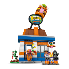 Los jugadores se lo pasarán genial dando forma al modelo del restaurante Hamburrrguesa (modular para animar a personalizarlo). Luego, en el interior, descubrirán un puesto de salsas, una máquina de refrescos y una caja registradora; en el exterior, encontrarán una terraza con una taza y un huevo frito. Tiene un ático desmontable con una figura de una araña y suficiente espacio para otros accesorios, como una pala y dinamita. Las minifiguras de Bombardera playera, Caudillo cárnico, Parco y un esqueleto darán vida a la acción.